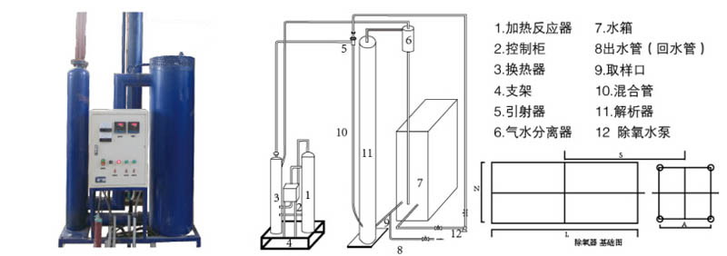 由于設備結構簡單,所以在設計和安裝方面沒有特別嚴格的要求,下列幾點在必要時可據具體情況進行不同程度的改動1、設備只需單地基,建議解吸器底部預埋鋼板,安裝時現場焊接;反應器底部只需水平; 2、設備距墻不少于30cm,設備的相對位置可根據具體情況有一些變動;3、在設備附近的墻上安置配電柜,功率因設備型號而異; 4、按流程根據現場條件將設備就位, 應注意保持解吸器頂部高于水箱最高水位2米以上;5、建議除氧泵揚程45~50米;除氧泵流量應為設備出力的1.25~1.5倍(型號參見表四);6、按流程將設備連接起來,接口除特定指明外以焊接為佳;設備及各管路應無泄漏; 7、在保證流程合理的前提下,設備可靈活布置,建議靠墻或邊角布置;8、設備布置困難時,可將引射器、解吸器氣水分離器與換熱器、加熱反應器、電控柜分開布置(如分置于室內外、分置于不同樓層等);9、若用戶需要有專用的密閉除氧水箱,可根據附圖進行連接.