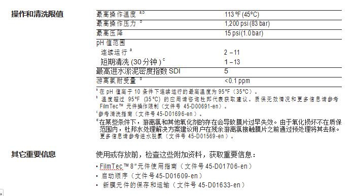 • 無需進行氧化后處理保證了在整個運行周期內都能保持高性能。FilmTec™ 元 件更耐用,且能在更寬泛的 pH 值范圍(1-13)內進行化學清洗。
