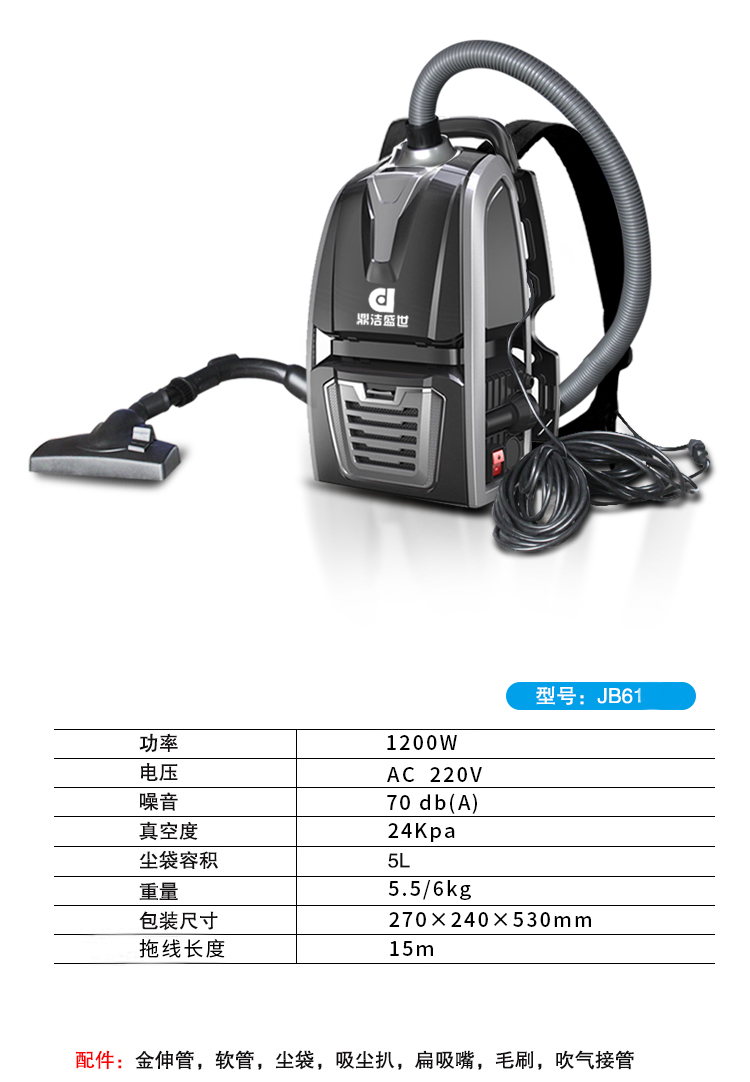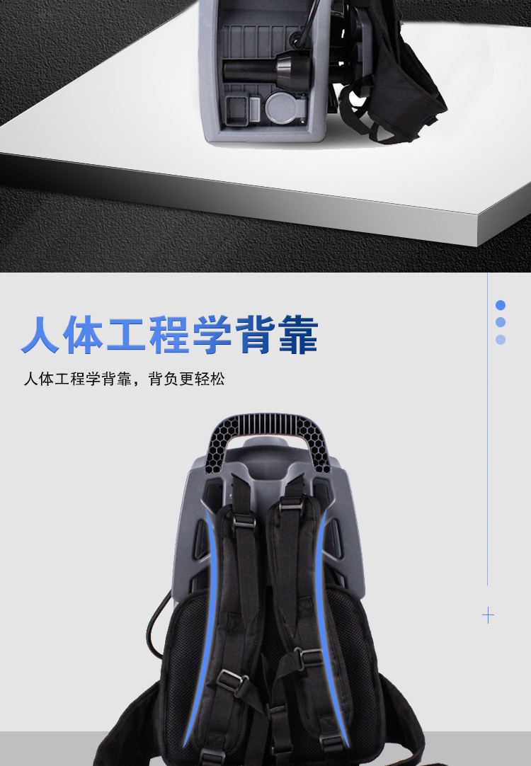 鋰電池動力源,無需拖線,肩背隨行,能完成常規(guī)吸塵器所不能涉及場所的清潔。 配備智能充電器。 自動溫控保護(hù),確保電機(jī)安全。 人體工程學(xué)背靠,背負(fù)更輕松。 更低的噪音,開啟“靜音”工作模式。 吸吹一體,清潔更方便。 選配式無紡布及紙塵袋,方便實(shí)用。