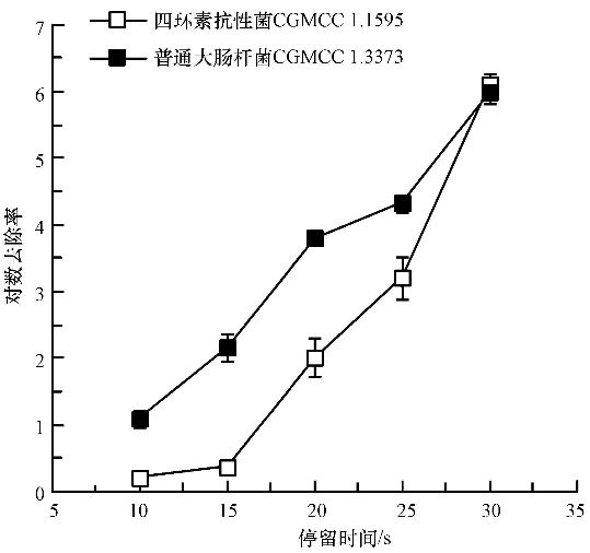 試驗(yàn)所用模式菌株分別為大腸桿菌(E.coli CGMCC 1.3373)和四環(huán)素抗性菌(E.coli CGMCC 1.1595),購于中國科學(xué)院菌種保藏中心.用營養(yǎng)肉湯液體培養(yǎng)基(蛋白胨10 g · L-1,牛肉浸出粉3 g · L-1,氯化鈉5 g · L-1)在37 ℃、160 r · min-1下培養(yǎng)16~24 h,10000 r · min-1離心10 min后,將菌體再懸浮于含0.05% NaCl的去離子水中,使水樣中模式菌濃度約為106 CFU · mL-1.