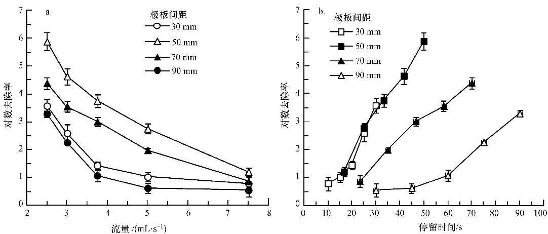 圖3 電極板間距對普通大腸桿菌對數(shù)去除率的影響(a.不同流量下的電化學(xué)滅活效果;b.不同停留時(shí)間下的電化學(xué)滅活效果)