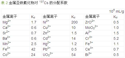 金屬亞鐵氰化物對銫的選擇性吸附能力強 ,相關研究較多 。 Bing Li 等 〔19〕考察了亞鐵氰化鋅對低放廢水中 134Cs 的去除效果及相關影響因素。 研究結果表 明 ,pH 為 1 ~10、 134Cs 初 始 放 射 性 活 度 為 3.2 ~ 160.0 kBq/L 時,投加 0.33 g/L 亞鐵氰化鋅即可去除 98%以上的 134Cs,60 min 內達到吸附平衡,吸附量為 9.6~463.0 kBq/g。 當 溫 度 為 0~50 ℃ 且Ca2+ 、Fe3+ 、 Mg2+、HCO3-、CO32-、Cl-、SO42- 存在時 ,亞鐵氰化鋅對 134Cs 的去除效果不受影響 ,但當溶液中含有 K+或 Na+時,134Cs 去除率降低 。 Changping Zhang 等 〔20〕用亞鐵氰化鉀鋅去除模擬廢水中的銫。 靜態試驗中 ,當亞鐵氰化鉀鋅投加量為 0.33 g/L,Cs+質量 濃 度 為 100 μg/L 時 ,在 15 ℃下振蕩吸附 60 min 后 Cs+的去除率可達 98%以上,DF 為 76; 小試采用吸附-微濾工藝 ,持續曝氣使吸附劑與廢水充分混合,出水經微濾膜過濾后用蠕動泵抽出 。 試驗處理水量 1320 L,濃縮產物體積為 2.28 L,出水中 Cs+的平均質量濃度為 0.59 μg/L,平 均 DF 為 208,CF 為 539,具 有 毒 性 的 CN-質量濃度 <2 μg/L。 V. V. Milyutin 等 〔21〕研究了不同 金 屬 的 亞 鐵 氰 化 物 共 沉 淀 微 量 銫 (105 Bq/L),當 Mn+與 Fe(CN)64-的物質的量比為 1.33 時 ,金屬亞鐵氰化物對 137Cs 的分配系數見表 2。