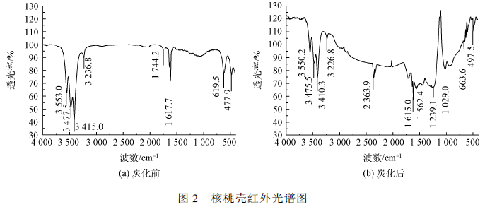 由圖2 可知, 核桃殼炭化前, 主要吸收峰有: 3 553. 0 cm - 1 、3 477. 5 cm - 1 、3 415. 0 cm - 1 和3 236. 8 cm - 1 處為O—H 的伸縮振動吸收峰, 1 744. 2 cm - 1 處為醛類C ?? O 的伸縮振動吸收峰,1 617. 7 cm - 1 處為N—H 彎(面內(nèi))曲振動吸收峰,619. 5 cm - 1 處為NH2 面外搖振動吸收峰,477. 9 cm - 1 處為C—I 伸縮振動吸收峰;氮炭化核桃殼的紅外掃面產(chǎn)生了新的譜帶,在2 363. 9 cm - 1 處增加了P—H 的伸縮振動吸收峰,C—O 與C—O—C 的伸縮振動吸收峰的疊加發(fā)生在1 239. 1 cm - 1 和1 029. 0 cm - 1 處,1 562. 4 cm - 1 處是N—H 彎曲(面內(nèi)) 振動,O—H 的伸縮振動吸收峰發(fā)生了偏移,分別在3 550. 2 cm - 1 、3 475. 5 cm - 1 、3 410. 3 cm - 1 和3 226. 8 cm - 1 處,NH2 面外搖振動吸收峰和C—I 伸縮振動吸收峰也發(fā)生了偏移,分別在663. 6 cm - 1 和497. 5 cm - 1 處。與前者相比較,氮炭化后的核桃殼吸收振動峰有一定的變化,說明在氮氣氛圍下炭化后核桃殼化學(xué)結(jié)構(gòu)有所改變,從增加的N—H 官能團也可以得出:核桃殼在炭化過程中,N2 也參與了反應(yīng)地進行。