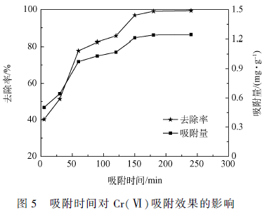 在0 ~ 60 min 內(nèi),對于組成成分是纖維素、半纖維素等吸附劑而言,吸附過程主要受Cr(Ⅵ)從溶液到吸附劑顆粒表面擴散的控制,去除效果一般,圖5 中可以看出當(dāng)t = 60 min 時,Cr(Ⅵ)的去除率為77. 8% ,隨著吸附時間的延長,其去除率與吸附量也逐漸增大。當(dāng)吸附時間增加至180 min 時,去除率達到99. 1% ,再延長時間,去除率趨于平衡,這可能是因為吸附劑吸附能力達到飽和,也就是說吸附劑表面的活性位點和炭化后所增加的官能團已全部吸附了Cr(Ⅵ)離子,故其去除率不再增加。因此選取吸附時間為180 min。