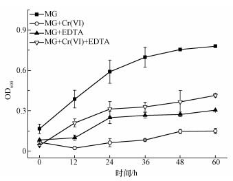 如圖 1所示,在空白實驗中(沒有重金屬Cr(Ⅵ)或者EDTA存在的條件下),即僅加入0.1 mmol·L-1的孔雀綠(MG)時,B. Cepacia C09G在前36 h快速生長,OD600接近了0.7,而后因為MG基本降解完,缺乏營養(yǎng)物質生物量增長緩慢,60 h后比較終OD600值為0.78;僅加入0.5 mmol·L-1 Cr(Ⅵ),對微生物的生長有很強的抑制作用,生物量很低,僅為0.15;僅加入0.5 mmol·L-1 EDTA,毒性雖然比Cr(Ⅵ)更小,但仍有一定的抑制作用,60 h時OD600為0.31.據報道,EDTA和EDTA-Metal對土壤微生物都是有毒的(Grcman et al., 2001).當同時添了EDTA和Cr(Ⅵ)時,OD600為0.42,大于單獨加入Cr(Ⅵ)或者EDTA時,說明其生物毒性比單獨加入Cr(Ⅵ)或EDTA有所降低,因此,可以推測EDTA可以有效降低Cr(Ⅵ)的毒性.