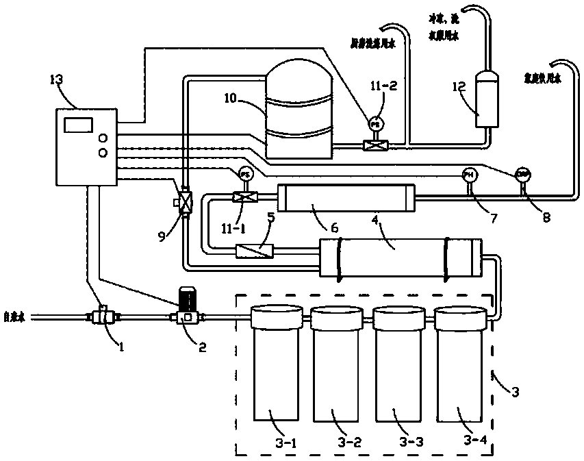 所述控制器(13)分別與所述進(jìn)水電磁閥(1)、所述增壓泵(2)、所述節(jié)水閥(9)、所述壓力桶(10)和所述第二高壓開關(guān)(11-2)相連接。