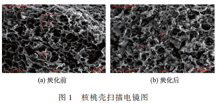 將核桃殼和氮炭化核桃殼先進行表面,采用電子掃面顯微鏡來測定其表面結構進行表征,同時利用KBr 壓片法,掃描范圍為400 ~ 4 000 cm - 1 ,選用傅里葉變換紅外光譜儀進行官能團分析。