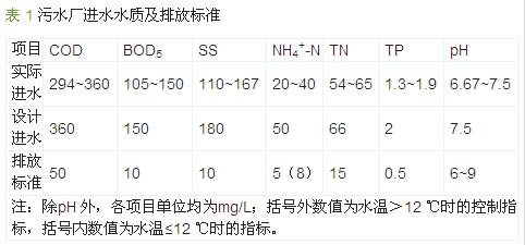 某污水處理廠日處理能力為7 萬m3,其污水主要由生活污水和部分工業(yè)污水組成,進水BOD5/COD <0.3,可生化性較差,TN 質量濃度較高,在54~65mg/L 范圍內,TP 質量濃度較低,僅為1.3~1.9 mg/L,其設計進水水質指標見表 1,其中排放標準指《城鎮(zhèn)污水處理廠污染物排放標準》(GB 18918—2002)一級A 標準。