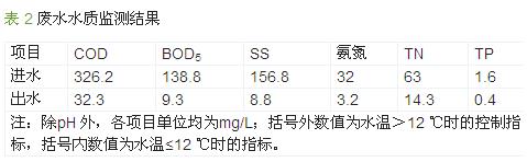 該工程于2009 年11 月建成,經過2 a 的運行,處理效果一直很穩(wěn)定,出水水質良好。2011 年10 月當地環(huán)境監(jiān)測部門對該廠進、出水水質進行了監(jiān)測,結果見表 2。