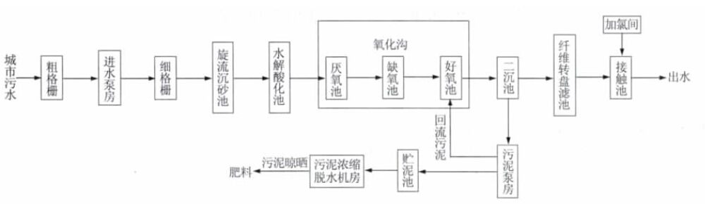 污水首先經過粗格柵去除較大的漂浮物,再經泵房將污水提升,經過細格柵和沉砂池去除部分漂浮物及泥沙等易沉物質后進入水解酸化池中,其中的大分子有機物經水解酸化后,降解成小分子的有機物,提高了污水的可生化性。之后污水進入氧化溝,在氧化溝的厭氧池內部分COD 被去除,污水的可生化性得到提高。經厭氧處理的污水進入缺氧池完成反硝化脫氮過程。從缺氧池出來的污水,與從二沉池回流的污泥一并進入好氧池,在好氧池內完成去除COD、硝化及吸磷過程。從氧化溝出來的污水進入二沉池進行固液分離,上清液流入纖維轉盤濾池做進一步處理,在纖維轉盤濾池中,污水中大部分的SS、部分COD 被除去,出水在接觸池內與二氧化氯充分混合,殺滅水中可能含有的細菌和病毒后排放。二沉池內排出的污泥一部分回流至好氧池,另一部分則進行濃縮脫水處理,加工成肥料再利用。