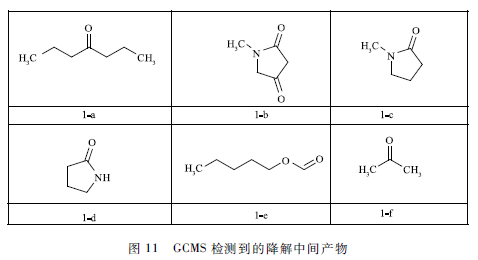 氧氣等離子體處理MB溶液15 min后,得到的溶液用GCMS和LCMS分析,檢測到的中間產物如圖11和12所示。根據已有研究和前面結果推斷,MB分子的降解主要通過3種途徑:高能電子攻擊、臭氧氧化和輕基化。
