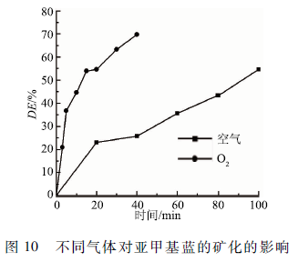 與圖8中的DE隨時間的變化曲線對比可知,MB的礦化比降解要慢許多。這是由于MB經過一系列的復雜的反應,生成許多有機中間體,由于MB分子相對容易被氧化,而生成的有機中間體比MB分子結構更加穩定,這些中間體與反應系統中的活性物質反應被降解的難度加大。因此,反應物系中有機物的礦化比MB的脫色更加困難,礦化速率相對較慢。