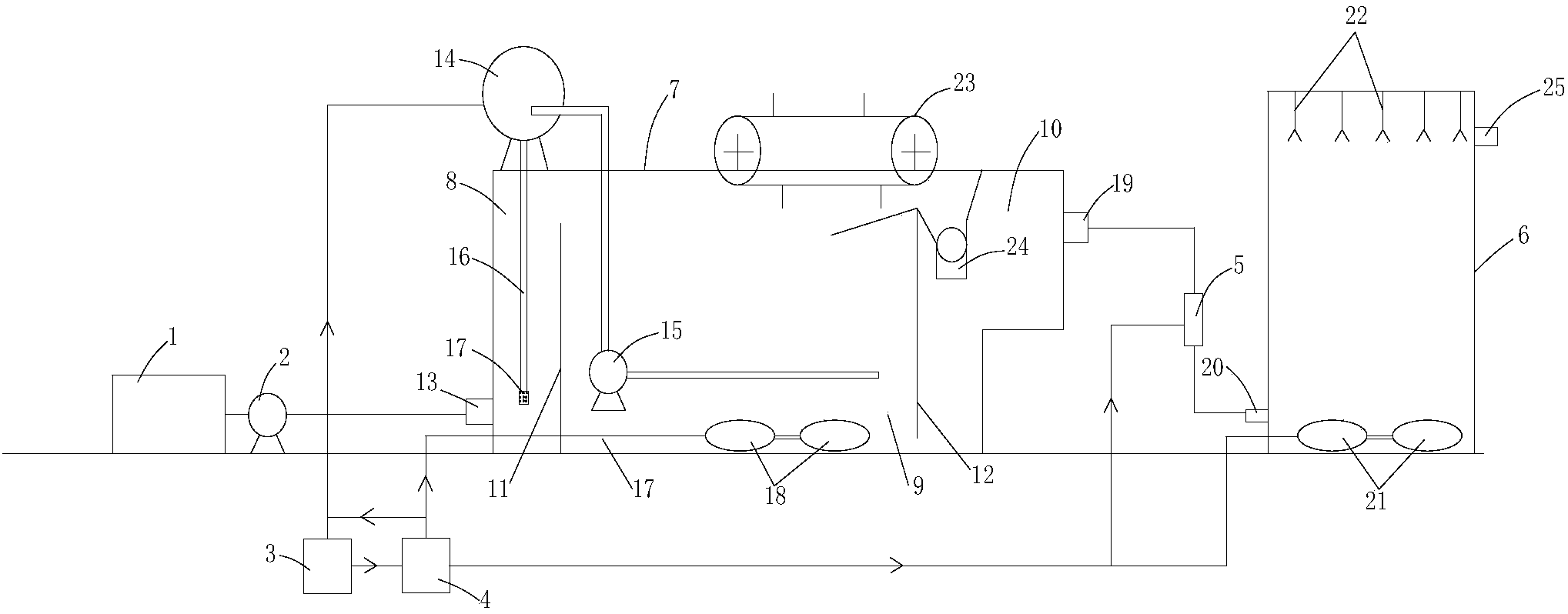 本實(shí)用新型提供的一種用于污水處理的氣浮裝置,通過在氣浮機(jī)的氣浮區(qū)的底部安裝有多個曝氣盤,曝氣盤均與臭氧發(fā)生器相連,在氣浮區(qū)內(nèi)實(shí)現(xiàn)臭氧曝氣,通過氧化作用分解氧化水中的有機(jī)物;之后氣浮機(jī)內(nèi)的清水在射流器內(nèi)實(shí)現(xiàn)臭氧與水的混合,混合后的水進(jìn)入催化氧化箱內(nèi),在催化氧化箱內(nèi)的下部設(shè)置有多個第二曝氣盤,第二曝氣盤均與臭氧發(fā)生器相連,在催化氧化箱內(nèi)進(jìn)行進(jìn)一步的臭氧曝氣,催化氧化箱內(nèi)的頂部設(shè)置有多個紫外線燈管,紫外線燈管發(fā)出的紫外線會將催化氧化箱內(nèi)的臭氧與水催化呈羥基,羥基具有更強(qiáng)的氧化能力,進(jìn)一步分解水中的有機(jī)物,經(jīng)過上述過程分解掉水中大部分的有機(jī)物,降低了水中的COD和BOD,提高了污水處理的質(zhì)量。