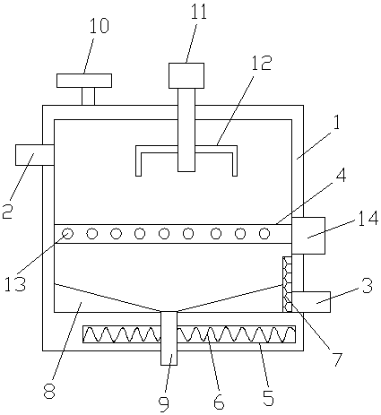 本發明的有益效果為:設置的箱體保持結構緊湊;設置的攪拌槳呈L型,保持污水混合均勻,保持污水處理效果好;設置的曝氣管能夠通入空氣,保持污水進行生物反應;設置的調壓閥能夠調節箱體內的氣壓,保持使用安全;設置的斜板方便污泥的排除,保持使用方便。