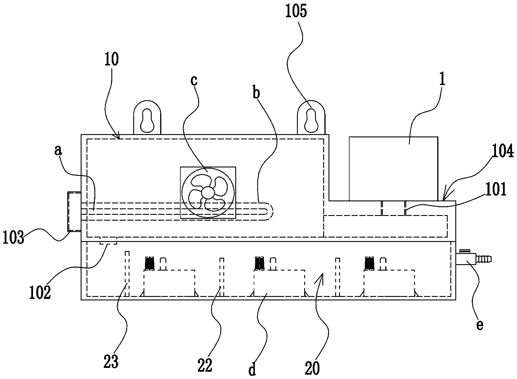 其二、本實(shí)用新型中,殼體內(nèi)部設(shè)有與殺菌室的出水口相通的霧化室,該霧化室設(shè)有噴霧口并配設(shè)有風(fēng)扇,霧化室內(nèi)設(shè)有至少一霧化器。經(jīng)殺菌室處理后的空調(diào)水流入霧化器,由霧化器霧化形成水霧,再由風(fēng)扇將水霧噴入室內(nèi)空氣中,以提高室內(nèi)的空氣濕度,避免室內(nèi)的空氣濕度因長時(shí)間使用空調(diào)而過低。