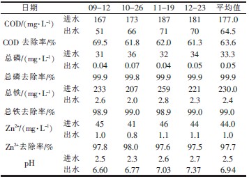 由表2 可見,調節─混凝—沉淀工藝處理酸洗廢水的效果較好,對金屬離子的去除率均較高,出水水質均符合《污水綜合排放標準》(GB 8978-1996)的一級排放標準要求,可見此工藝適于處理小型機械廠內部酸洗廢水。該工藝對總磷、總鐵和Zn2+的平均去除率分別為99.9%、99.0%和97.7%,但對COD的去除率僅為63.6%,主要是因為該廢水的COD 較其他同類廢水偏低,工藝設計時COD 的去除并非主要考慮因素,但出水COD 仍能達到《污水綜合排放標準》(GB 8978-1996)中的一級排放標準要求。