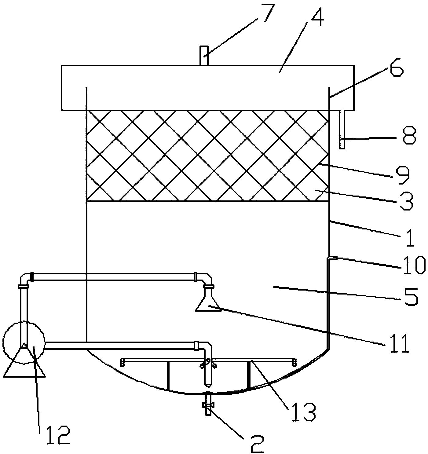 本實用新型,一種污水處理厭氧反應器:儲存于廢水箱的污水由恒流泵打入反應器后,首先進入射流布水器并在其中得到均勻分配,從而達到布水均勻的目的。當間歇操作的水力循環裝置運行時,到達倒漏斗取水口下方的泥、水、氣混合液在循環泵的強大動力作用下,由倒漏斗取水口吸入循環管,經循環泵打入布水系統而重新均勻分配到反應器池底,同時池底因為具有一定的弧度而不易產生死角。水流上升,當混合液與填料層碰撞后,氣體首先逃逸,由反應器頂端的排氣口排出并收集利用,厭氧污泥因為自身的重力作用和填料層的攔截作用而發生沉淀使水質變得澄清,經溢流堰溢流后從出水口排出。