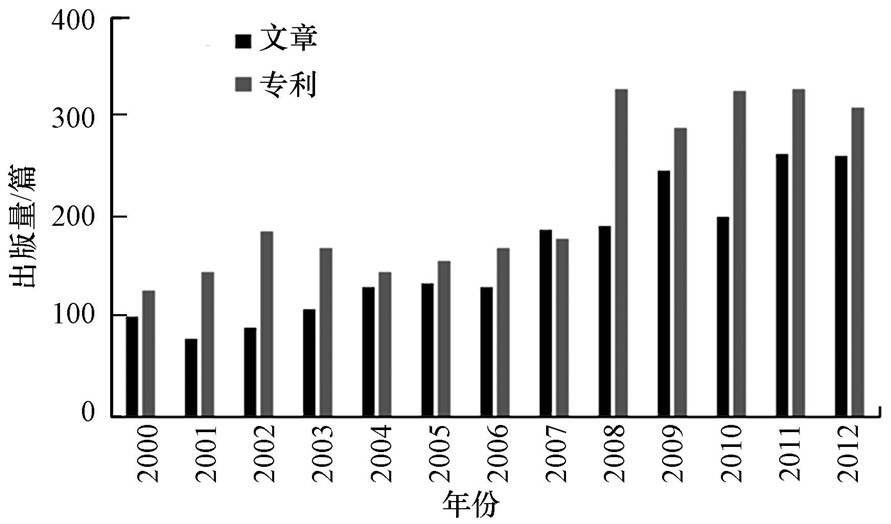 本研究所獲得的數(shù)據(jù)分別來自文獻(xiàn)檢索和專利檢索,并通過文獻(xiàn)計(jì)量分析法對其進(jìn)行統(tǒng)計(jì)分析.文獻(xiàn)和專利檢索的時(shí)間跨度均為2000—2012年.