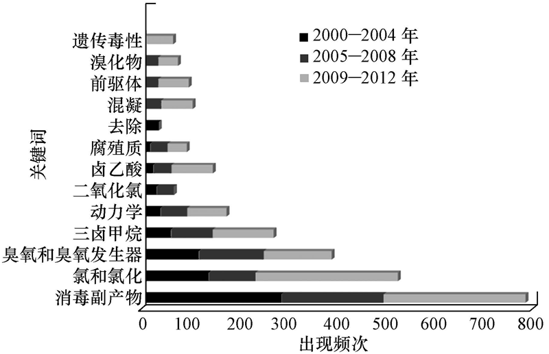 為了了解2000—2012年飲用水消毒領(lǐng)域的主要研究方向及整體變化趨勢,我們對本領(lǐng)域處于前10位的關(guān)鍵詞及其出現(xiàn)的頻次進(jìn)行了統(tǒng)計(jì),并且細(xì)分了3個(gè)階段(2000—2004年、2005—2008年和2009—2012年)來研究.如圖 2所示,“消毒副產(chǎn)物”、“氯和氯化”、“臭氧和臭氧發(fā)生器”、“三鹵甲烷”、“鹵乙酸”和“腐殖質(zhì)”這幾個(gè)關(guān)鍵詞在3個(gè)階段均排在前10位,表明這13年來飲用水的消毒研究方向主要集中在消毒工藝方法和消毒副產(chǎn)物兩方面.其中“消毒副產(chǎn)物”、“氯和氯化”、和“臭氧和臭氧發(fā)生器”這3個(gè)關(guān)鍵詞在3個(gè)時(shí)間段的出現(xiàn)頻次始終處于領(lǐng)先地位,進(jìn)一步確定消毒工藝方法和消毒副產(chǎn)物研究在飲用水消毒領(lǐng)域研究的重要性.