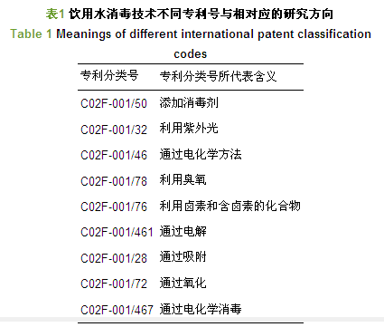 我們對2000—2012年消毒技術(shù)熱點(diǎn)專利進(jìn)行分析,了解研究者重點(diǎn)將哪些研究成果轉(zhuǎn)化為技術(shù)應(yīng)用于實(shí)際生產(chǎn)中.根據(jù)圖 3和表 1我們發(fā)現(xiàn)該領(lǐng)域的技術(shù)熱點(diǎn)集中在飲用水消毒工藝技術(shù)和消毒副產(chǎn)物去除兩方面.研究者重點(diǎn)關(guān)注的消毒技術(shù)從高到低依次為:消毒劑消毒、紫外消毒、電化學(xué)消毒、臭氧消毒、電解消毒.可以看出除傳統(tǒng)消毒技術(shù)以外,越來越多新型消毒技術(shù)被應(yīng)用.這些技術(shù)可以控制消毒過程中副產(chǎn)物的產(chǎn)生,從而降低消毒副產(chǎn)物對人體健康和生態(tài)環(huán)境帶來的潛在危害和風(fēng)險(xiǎn).