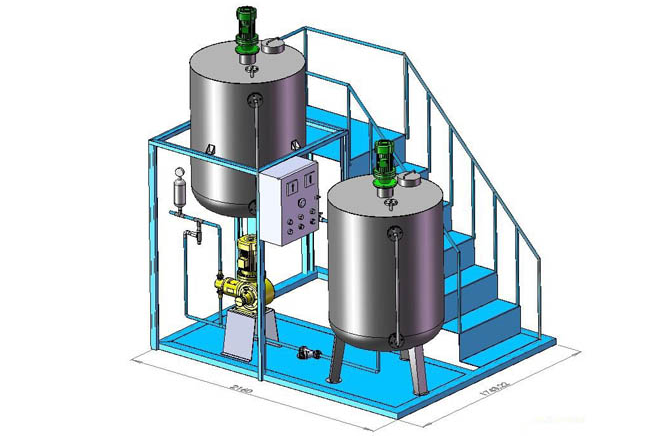 本裝置主要包括藥液溶配系統、計量投加系統、安全系統和控制系統等四部分。