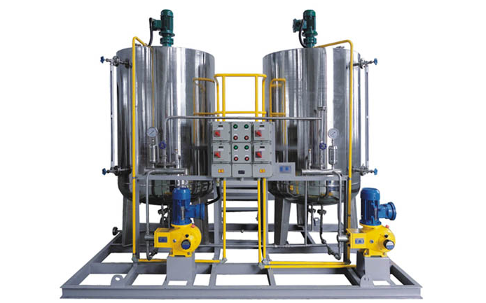 2、加藥裝置組成結構有:溶液箱、液位計、計量箱、攪拌器、加藥計量泵、安全閥、壓力表、控制柜、閥門以及管路集中布置,各部件的材質主要分不銹鋼和碳鋼襯膠。