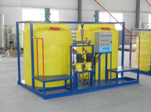 固體藥劑加入溶藥箱內(nèi)然后按比例加入工業(yè)水?dāng)嚢枞芙猓捎嬃客都酉到y(tǒng)投加藥點。投加控制可