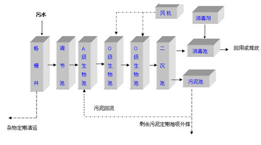 廢水經(jīng)格柵攔截去除水中廢渣、紙屑、纖維等固體懸浮物,進(jìn)入調(diào)節(jié)池,在調(diào)節(jié)池內(nèi)均質(zhì)、均量后經(jīng)泵提升至A級(jí)生物池,在A級(jí)生物池段異養(yǎng)菌將 污水中可溶性有機(jī)物水解為有機(jī)酸,使大分子有機(jī)物分解為小分子有機(jī)物,不溶性的有機(jī)物轉(zhuǎn)化成可溶性有機(jī)物,將蛋白質(zhì)、脂肪等污染物進(jìn)行氨化。在O級(jí)生物池段存在好氧微生物及消化菌,其中好氧微生物將有機(jī)物分解成CO2和H2O;在充足供氧條件下,硝化菌的硝化作用將NH3-N氧化為NO3-,通過(guò)回流控制返回至A級(jí)生物池,在缺氧條件下,異氧菌的反硝化作用將NO3-還原為分子態(tài)氮,接觸氧化池出水自流進(jìn)入沉淀池進(jìn)行沉淀,沉淀池出水進(jìn)入過(guò)消毒池進(jìn)行二氧化氯消毒,消毒出水達(dá)標(biāo)排放。