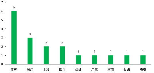 18家公司的地域分布主要集中在長三角地區(qū),其中江蘇省有6家企業(yè),浙江有3家企業(yè),上海有2家企業(yè),共占比61%。