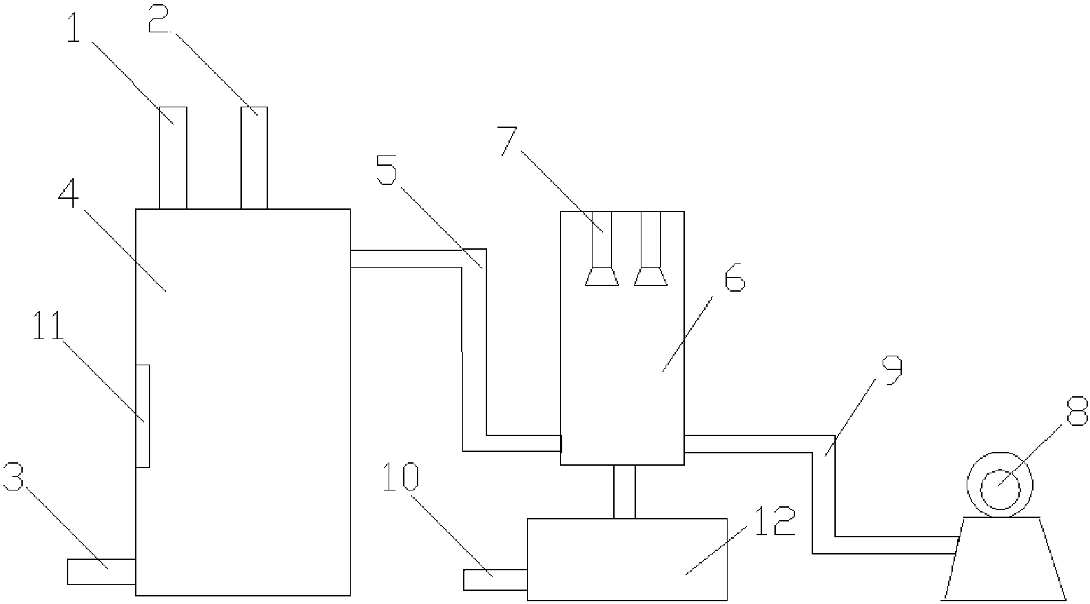 6.一種含氰廢水的回收設備,包括反應釜(4)、吸收塔(6)、噴射器(7)、風機(8)、吸收槽(12),其特征在于,反應釜(4)頂部設置母液進液管(1),底部設置廢液出液口(3);管道(5)一端連接反應釜(4)頂部,另一端連接在吸收塔(6)底部;吸收塔(6)塔內上方設置噴射器(7),吸收塔(6)下方設置進風管(9);進風管(9)一端連接吸收塔(6),另一端連接風機(8);吸收塔(6)底部設置吸收槽(10),吸收槽(12)底部連接有排液管(10)。