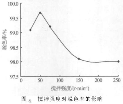 由圖6 可知,攪拌強(qiáng)度較小時(shí),脫色率較高,攪拌強(qiáng)度在50 r/min 左右時(shí),脫色效果比較好,攪拌強(qiáng)度超過150 r/min,脫色率明顯下降。實(shí)驗(yàn)中亦觀察到在慢攪情況下,形成的絮體較大,沉降較快;快攪情況下,形成的絮體較小,沉降較慢,這是因?yàn)樗l件對(duì)絮凝與凝聚行為影響很大。但攪拌速度太小,復(fù)合絮凝劑未能與污染物充分接觸, 自然會(huì)影響脫色效果;攪拌速度過大,絮體易被打碎,影響絮團(tuán)對(duì)污染物的架橋吸附及網(wǎng)捕作用,造成脫色率下降。具體參見污水寶商城資料或http://www.dowater.com更多相關(guān)技術(shù)文檔。