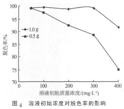 由圖4 可知, 復(fù)合絮凝劑投加質(zhì)量為0.5 g 時(shí),隨溶液初始濃度的增加,脫色率呈下降趨勢(shì);當(dāng)投加質(zhì)量為1.0 g 時(shí),在溶液初始質(zhì)量濃度﹤300 mg/L 的范圍內(nèi)均有95%以上的脫色率,溶液初始質(zhì)量濃度超過300 mg/L 以后,脫色率顯著下降。這說明單位質(zhì)量絮凝劑存在一比較大絮凝量, 超過此范圍處理效果下降。