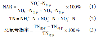 傳統脫氮需經過NO2-→NO3-的過程,短程硝化可將硝化過程終止于亞硝酸鹽階段,抑制亞硝酸鹽氧化菌(NOB) 的活性,從而實現亞硝酸鹽的積累,與傳統工藝相比可節省供氧量25%、節省反硝化碳源40%、減少污泥生成量50%、減少投堿量、縮短反應時間。但是,AOB 生長緩慢,易流失,難以在系統中維持較高的污泥濃度。因此,如何持久地維持較高濃度NO2-的積累及影響NO2-的積累因素成為研究的重點。目前研究焦點多集中于短程硝化與厭氧氨氧化聯合工藝的研究。