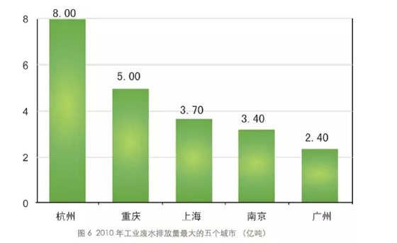 作為中國制造業聚集地,長三角和珠三角的三個省份必定入榜,如圖5所示,五大省份的工業廢水排放量占了全國總量的44%。若以城市排放量為依據,則如圖6所示,這五大城市的排放量占全國工業廢水排放總量的9%強。可以看出,這些工業廢水的主要來源地全都分布在重要水域,印證了重污染企業臨水而建的說法。這種布局在給企業造成生產便利的同時,也給了私自取水和非法排水等行為以可乘之機,給監管實施帶來巨大挑戰。