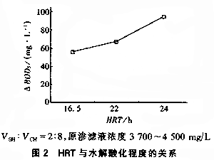 混合廢水經ABR處理后,其BOD5/COD比值明顯提高,當進水BOD5/COD較低時,效果更為顯著。如進水為0.665時,出水達0.68,進水為0.2~0.3時,出水可提高至0.4~0.6。ABR對出水BOD5/COD的改善,無疑可促進混合廢水好氧處理的效果和運行穩定性。 BOD5/COD的提高反映了ABR反應器良好的水解酸化作用。研究表明,對不同的混合比、原滲濾液濃度、HRT,ABR反應器可獲得不同程度的水解酸化作用。原滲濾液濃度和混合比較低時,產甲烷作用較弱,表觀水解程度與實際水解程度接近;當原滲濾液濃度和混合比較高時,甲烷發酵加強,表觀水解酸化度與實際情況差別較大。研究還發現,當原滲濾液濃度及混合比均較低時,水解酸化作用與HRT呈正相關(見圖2,其中ΔBOD5表示進出水濃度之差)。