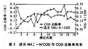 2.2 進水NH4+-N/COD和COD/TP與COD的去除率關系