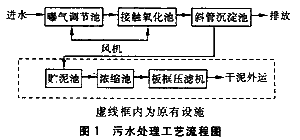 廢水先流入調節池進行預曝,然后泵入生物接觸氧化池,出水自流入斜管沉淀池,沉淀出水直接排放。污泥排入貯泥池,再泵入濃縮池,經板框壓濾機處理。