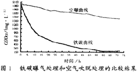 直接將印染—堿減量混合污水置于由等體積鐵屑、焦碳組成的鐵碳反應(yīng)池[4]中進(jìn)行曝氣處理試驗(yàn)。圖1是相同試驗(yàn)條件下該混合污水經(jīng)鐵碳曝氣處理和僅經(jīng)空氣吹脫處理的比較結(jié)果。圖1結(jié)果表明:在長(zhǎng)達(dá)72h的處理過(guò)程中,鐵碳曝氣處理可使混合污水CODCr去除率達(dá)到90.5%,其中前14hCODCr去除速率較快,而直接空氣曝氣吹脫處理實(shí)際去除率很低。