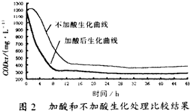 圖2是印染—堿減量混合污水少量加酸調(diào)pH值至10左右與不加酸直接生化處理的比較結(jié)果,結(jié)果表明:不加酸中和的混合污水在生化反應(yīng)上有一個(gè)滯后期,其后雖然CODCr去除速率與加酸中和污水的差不多,但污水處理比較終的殘余CODCr濃度卻比加酸中和污水的殘余CODCr濃度高出約100mg/L,這說(shuō)明在污水中少量加酸中和有利于生化處理。