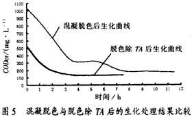 圖5是將印染—堿減量混合污水僅進(jìn)行化學(xué)混凝脫色預(yù)處理與脫色后再酸化除TA污水的生化處理比較結(jié)果。結(jié)果表明:脫色再除TA污水生化性能較好。
