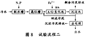 試驗(yàn)流程二見(jiàn)圖8。此試驗(yàn)是先進(jìn)行A/O生化處理,然后進(jìn)行混凝沉淀后處理的流程試驗(yàn)。