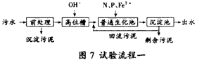 試驗(yàn)流程一見(jiàn)圖7。此試驗(yàn)是采用酸化—化學(xué)混凝處理,使污水CODCr濃度大大降低后,再進(jìn)行生化處理的流程試驗(yàn)。