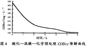 圖4是混合污水經(jīng)酸化—化學(xué)混凝預(yù)處理后污水的生化降解曲線(xiàn)。結(jié)果表明:經(jīng)化學(xué)混凝處理的出水繼續(xù)進(jìn)行生化處理,可以做到達(dá)標(biāo)排放。