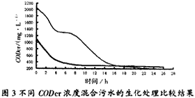 圖3是高CODCr濃度混合污水與較低CODCr濃度混合污水的生化處理比較試驗(yàn)結(jié)果。結(jié)果表明:采用好氧生化處理時(shí),欲達(dá)到相同的處理出水水平,高濃度污水需處理較長(zhǎng)時(shí)間。