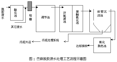 由于苧麻脫膠廢水中含有大量天然色素,經過生化和物化處理后,色度的去除仍不理想,因此在工藝設計中增加氧化池,即加入氧化劑氧化這些天然色素,使大部分有色有機物能迅速分解,使廢水經處理后能穩定達標排放。