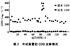 運行期間進水COD的平均值為366.4 mg/L,比較大值為780.9 mg/L,比較小值為228.0 mg/L。出水COD的平均值為13.1mg/L,比較大值為25.2mg/L,比較小值為4.4mg/L,COD的平均去除率為96.0%;沖擊負荷對出水COD去除沒有影響,這說明系統的穩定性和可靠性。試驗結果如圖2所示。