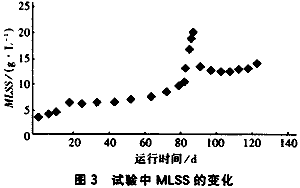 從運行結果看,國產膜分離性能良好,運行過程中無剩余污泥排放,MLSS變化如圖3所示。