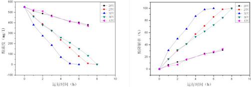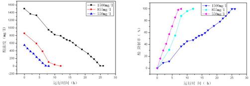 圖為相同的MLSS=3500mg•L-1,pH=7.2,T=25ºC,不同初始濃度下苯酚濃度與時(shí)間的關(guān)系圖,從圖中看出,酚初始濃度為550 mg•L-1時(shí),經(jīng)過8h時(shí),酚初始濃度為855 mg•L-1時(shí),經(jīng)過12h,酚初始濃度為1500 mg•L-1時(shí),苯酚經(jīng)過26h,苯酚降解完全,降解率達(dá)到99%以上。