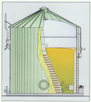 原理:在一個密閉罐體內完成料液的發酵、沼氣產生的過程。消化器內安裝有攪拌裝置,使發酵原料和微生物處于完全混合狀態。投料方式采用恒溫連續投料或半連續投料運行。新進入的原料由于攪拌作用很快與發酵器內的全部發酵液菌種混合,使發酵底物濃度始終保持相對較低狀態。