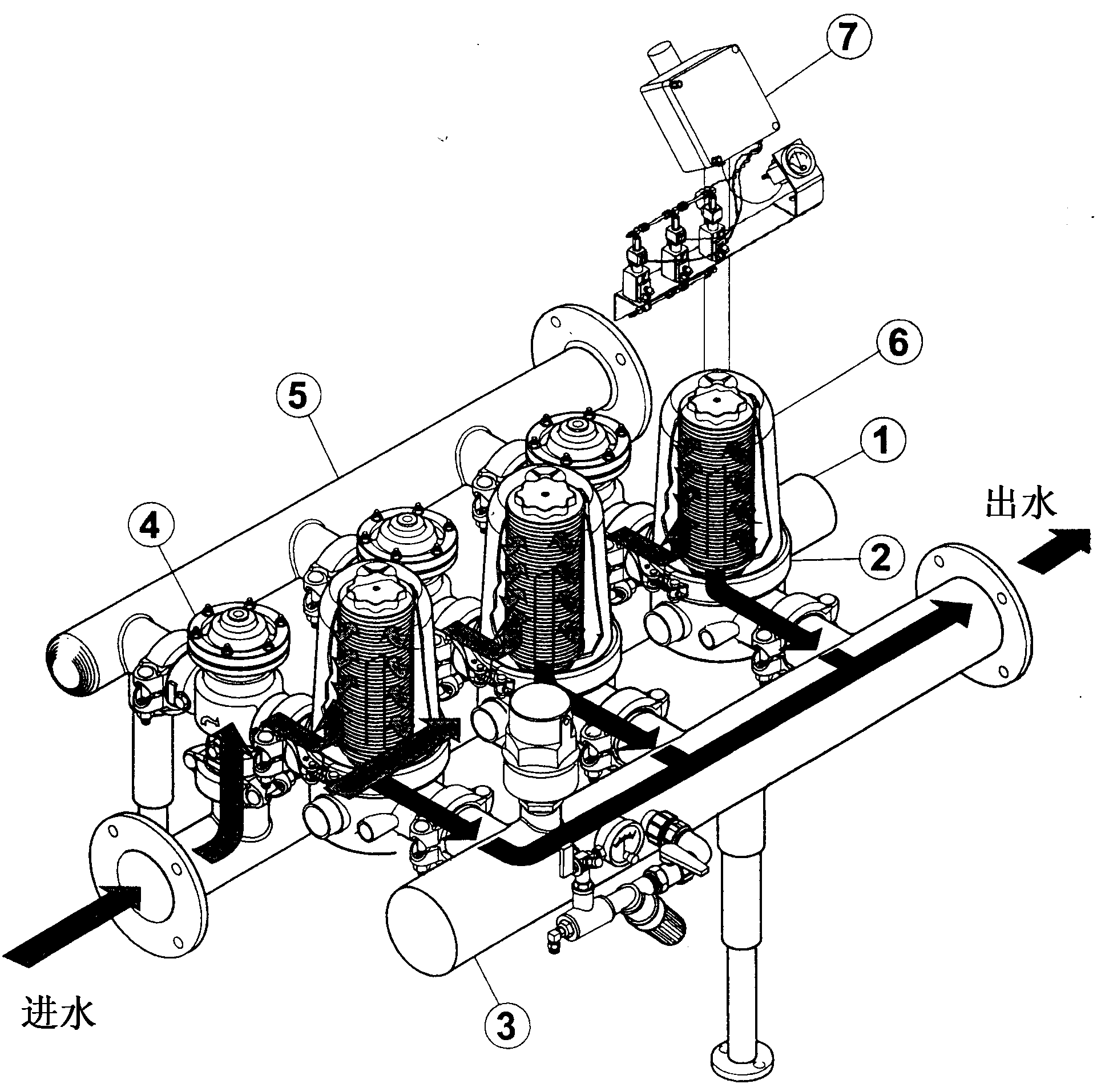 反沖洗循環由控制器(7)上的壓差數據控制,并通過時間控制器的信號開啟和關閉沖洗閥(4)。控制器(7)控制沖洗過程,以使在同一時間僅有一只過濾單元處于反沖洗狀態,同時其他過濾單元繼續向系統中提供干凈的清水。沖洗過程持續一定時間后自動停止,持續的時間可以預先在控制器上設定。